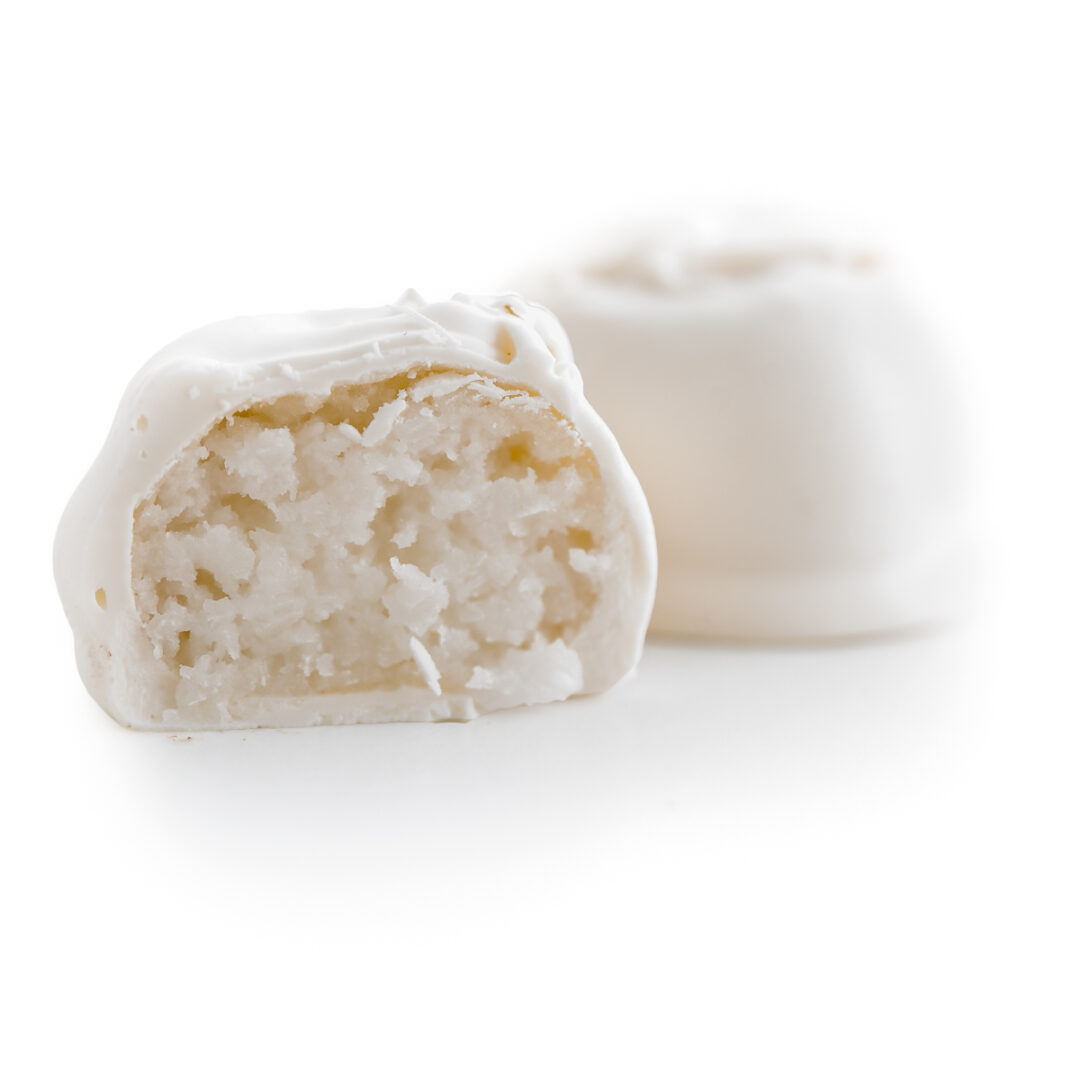 A coconuty explosion for your taste buds. Dipped in creamy white chocolate