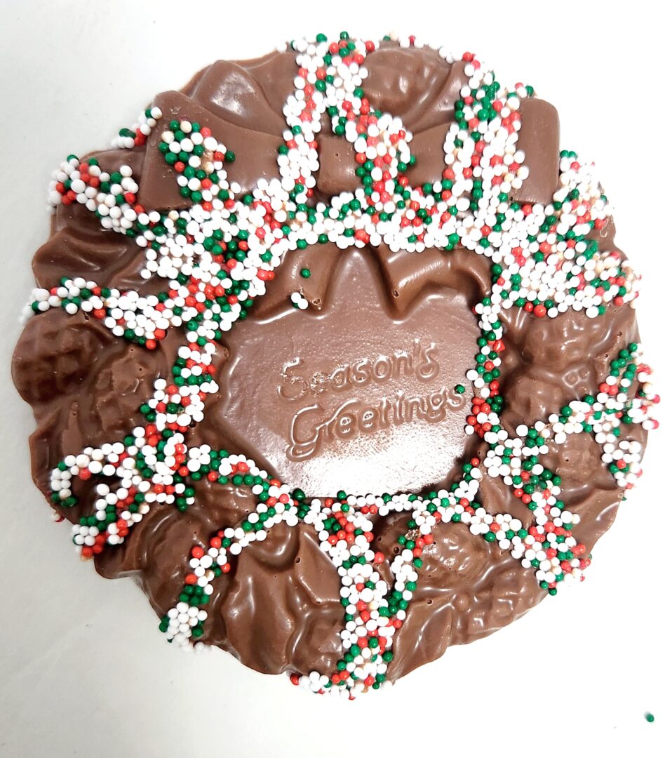 A creamy milk chocolate wreath. Makes a great stocking stuffer. Approximately 4 inches round.