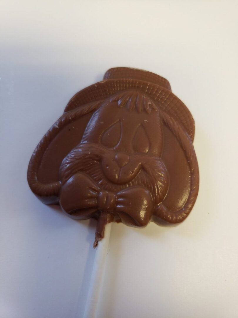 Cream milk chocolate bunny pop with floppy ears and a bow tie. (May substitute with similar pop of equal value.)
