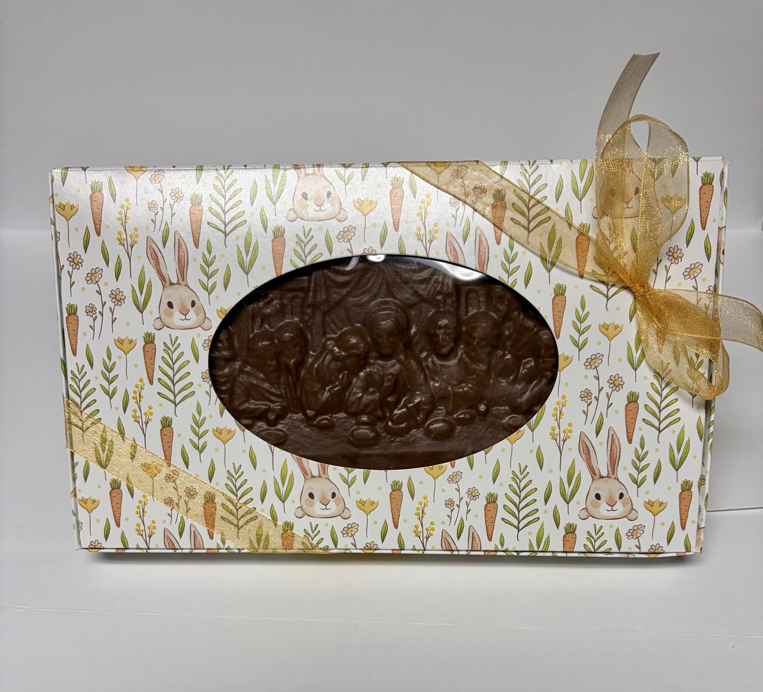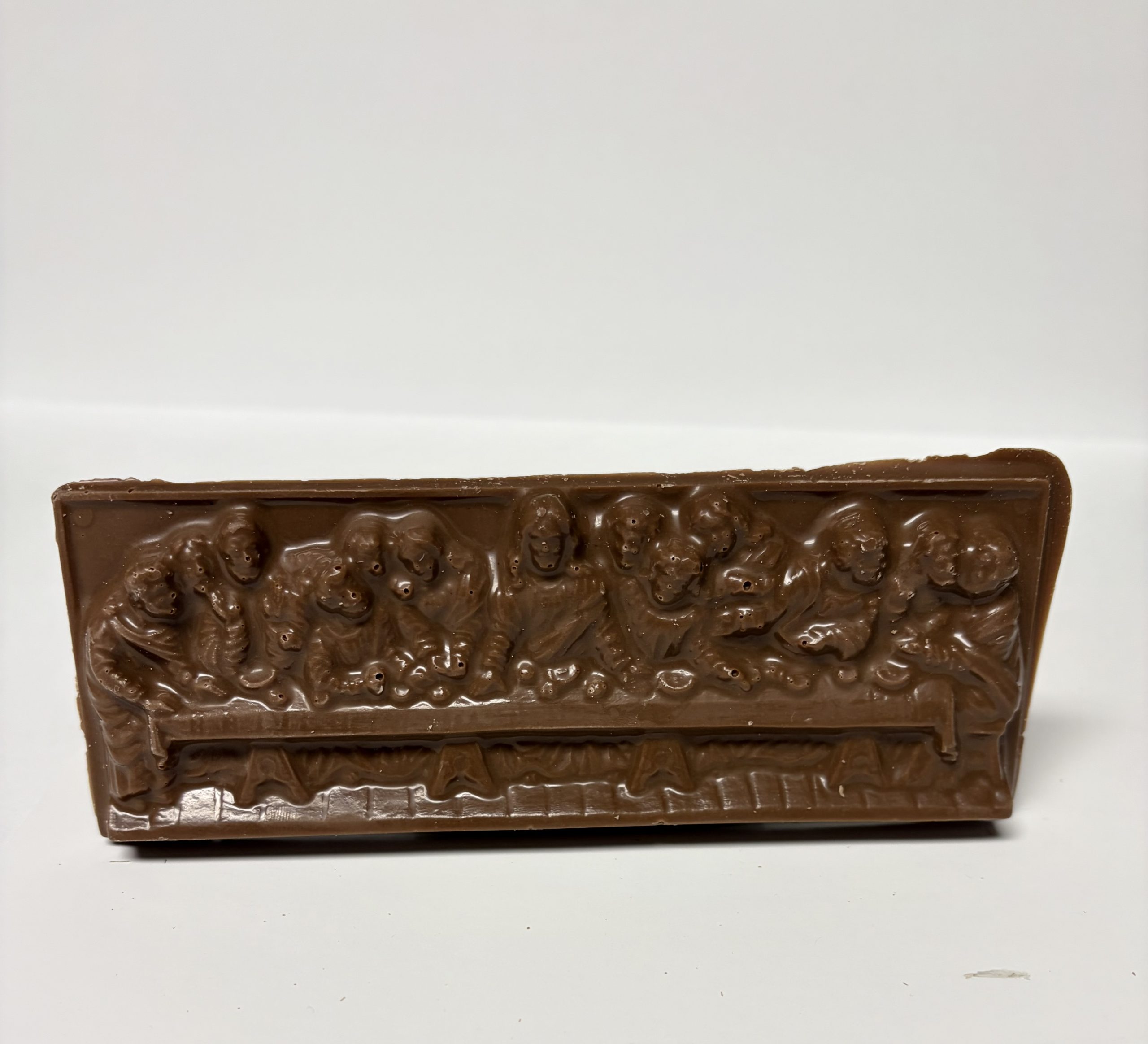 Beautiful depiction of the Last Supper in Rheb’s milk chocolateedible art available in two sizes: