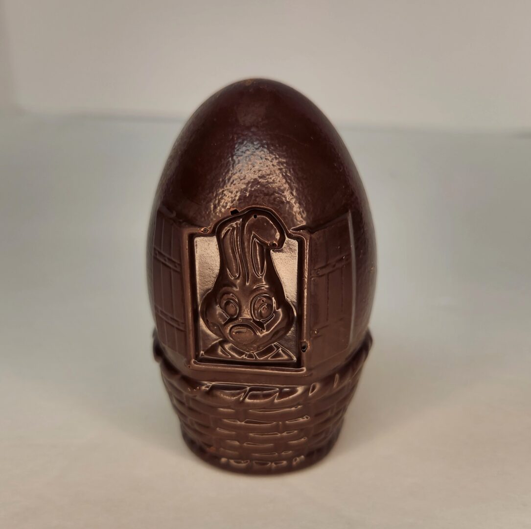 Little egg shape “house” with smiling bunny in window. Hollow dark chocolate, approx 3-1/2″