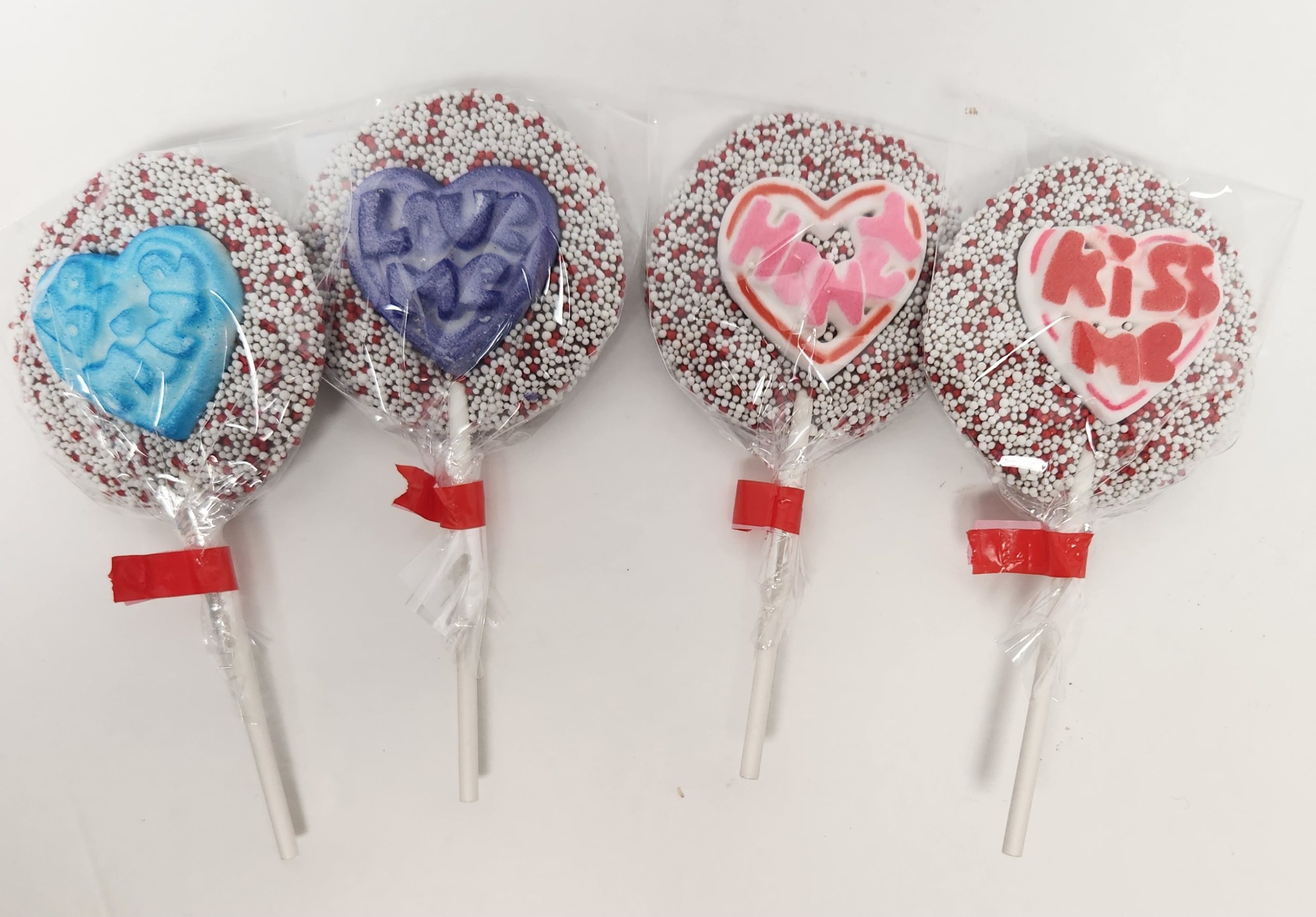 Our creamy milk chocolate pop with non pareils and sugar heart decoration. (Decoration may vary in color and design depending on availability.)