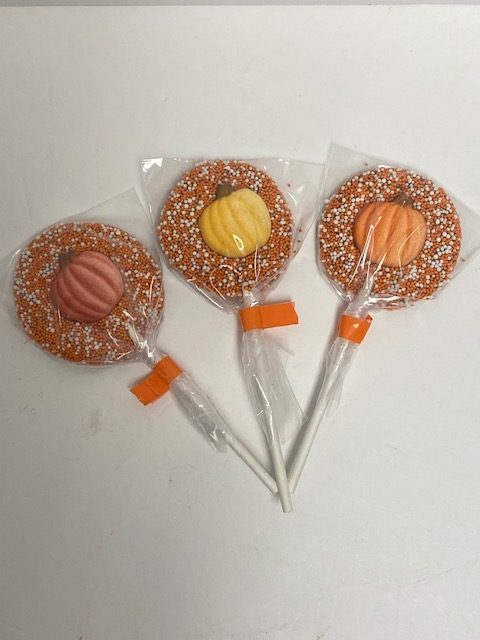 Our milk chocolate pop covered in nonpareils with a perfect pumpkin decoration is sure to be a fall treat for kids young and old.